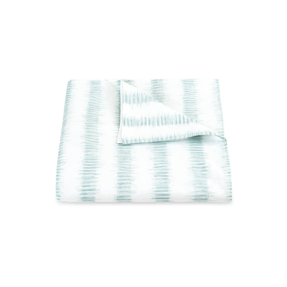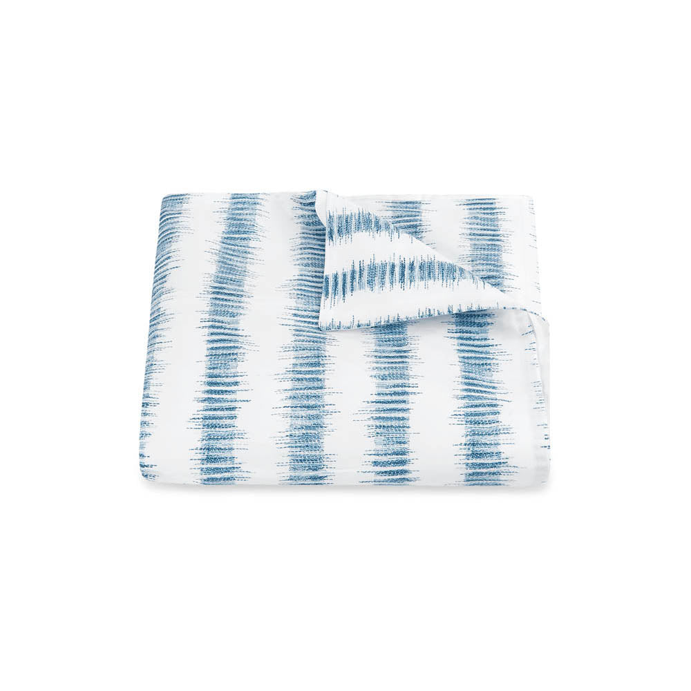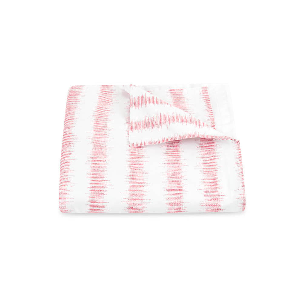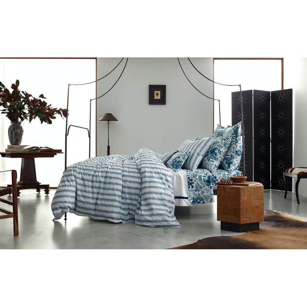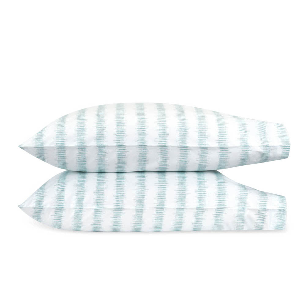 Attleboro, a print drawn from an archival Schumacher design, mimics the distinctive look of dyed textiles; here, Ikat-like blurred strokes are arranged in hazy stripes and printed on our 500 thread count Luca Egyptian cotton percale. Attleboro's palette of subtle colors matches back beautifully to our bold Pomegranate print, bringing a modern verve to that traditional pattern.