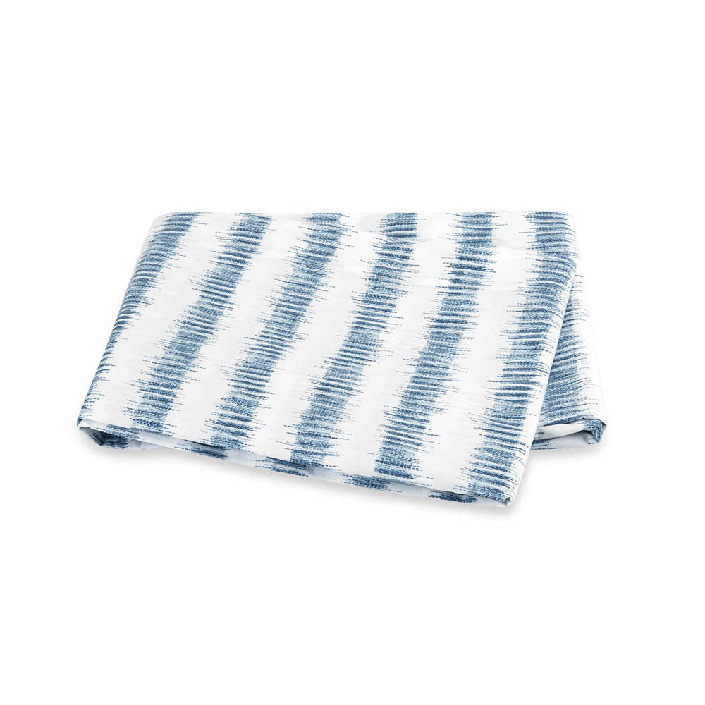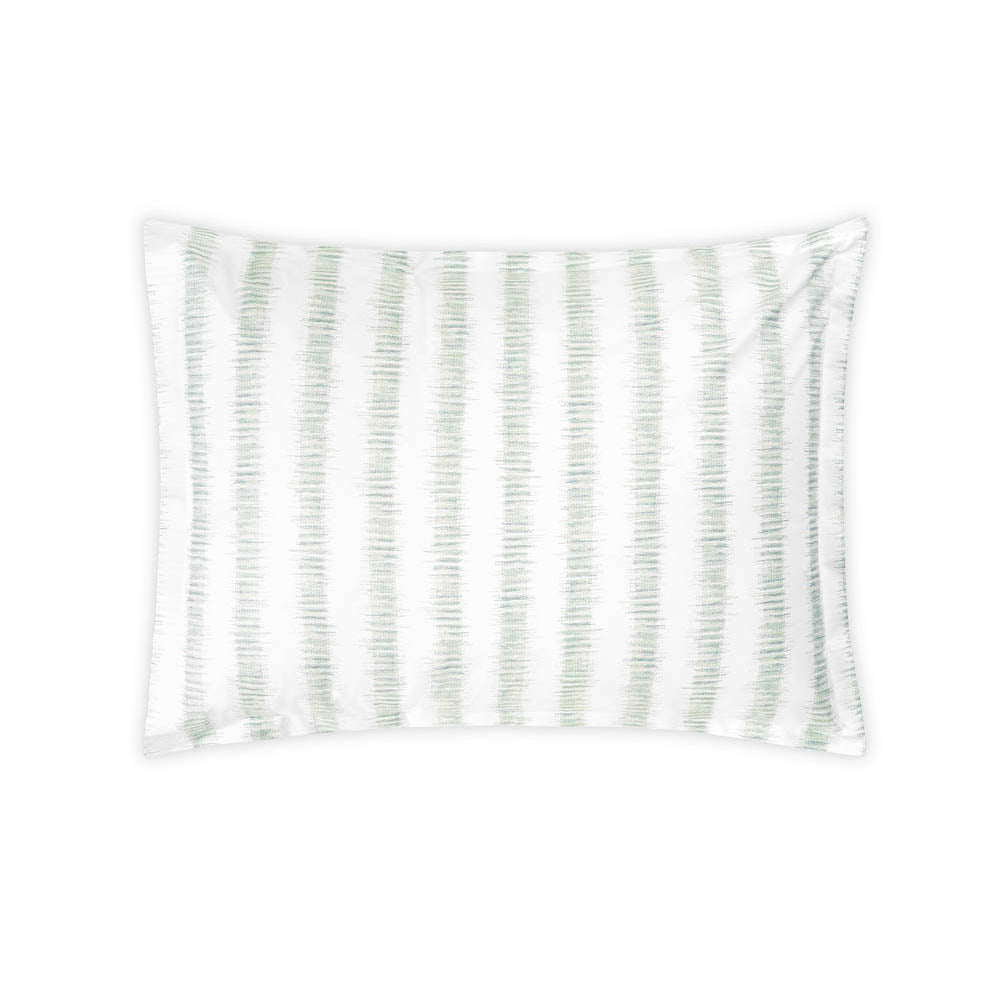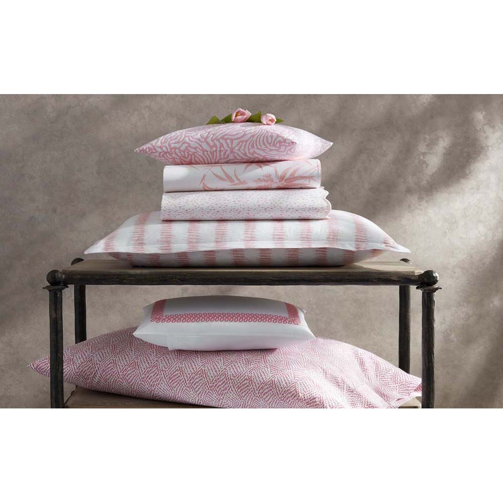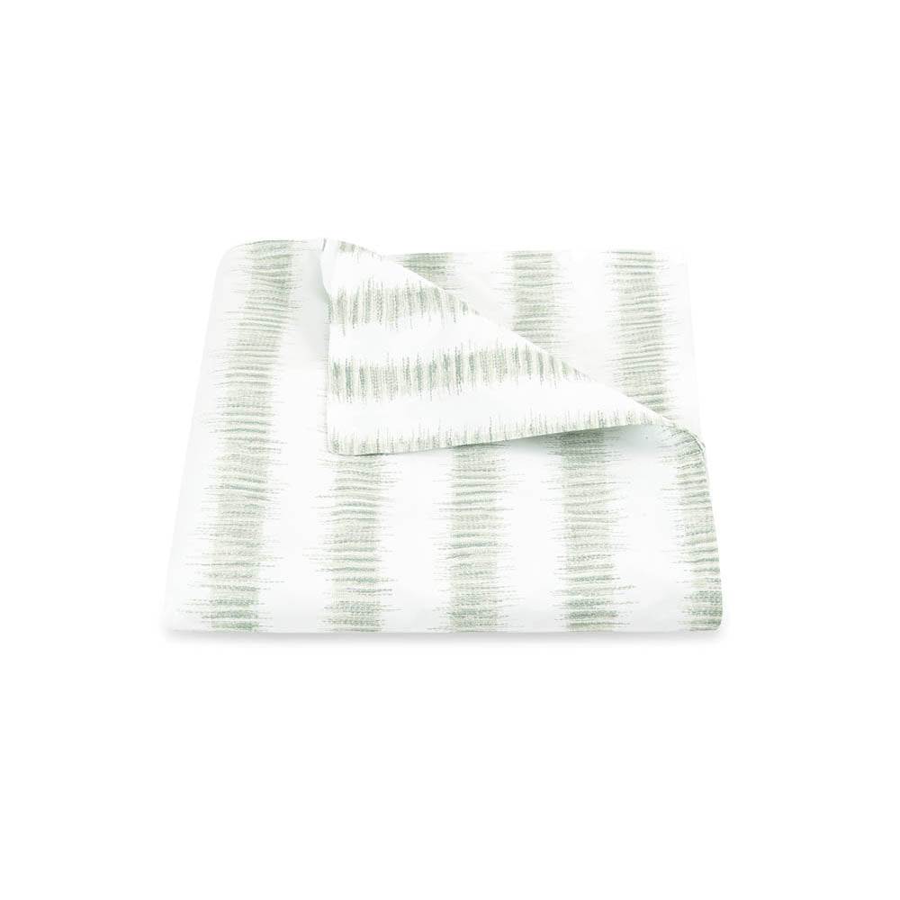 Attleboro, a print drawn from an archival Schumacher design, mimics the distinctive look of dyed textiles; here, Ikat-like blurred strokes are arranged in hazy stripes and printed on our 500 thread count Luca Egyptian cotton percale. Attleboro's palette of subtle colors matches back beautifully to our bold Pomegranate print, bringing a modern verve to that traditional pattern.