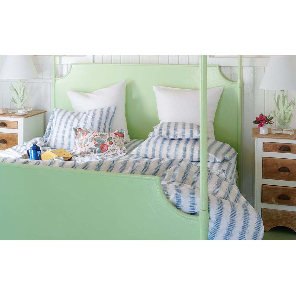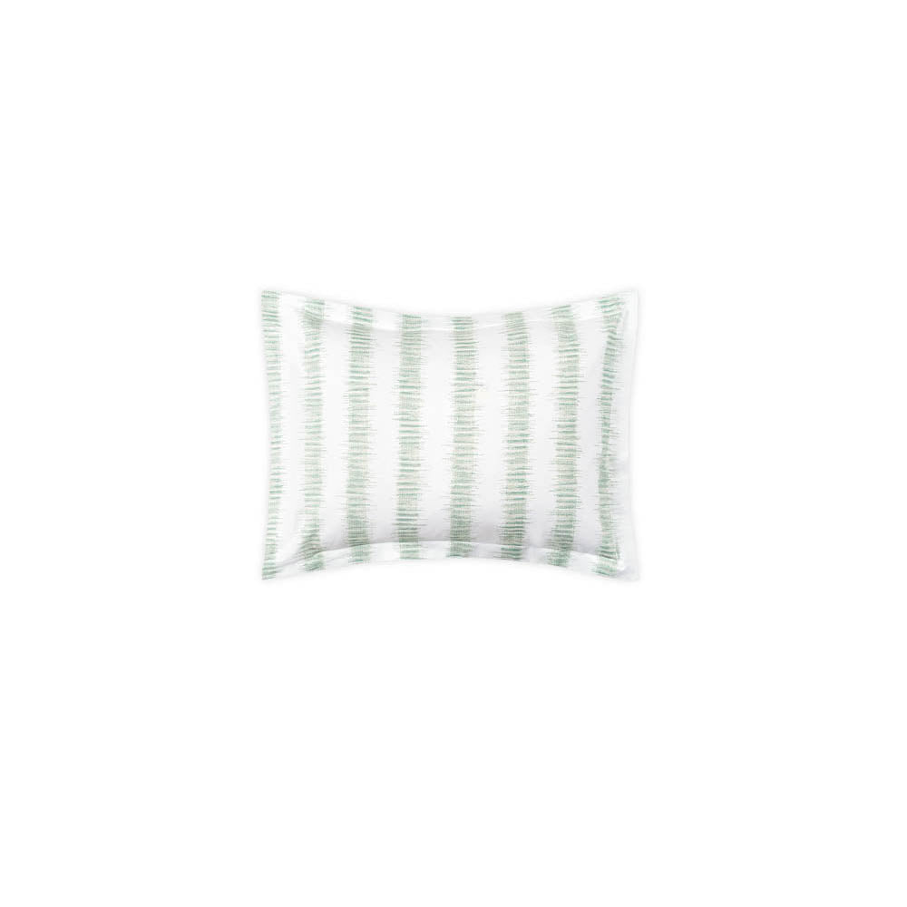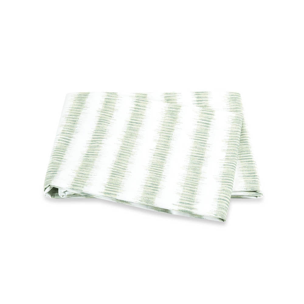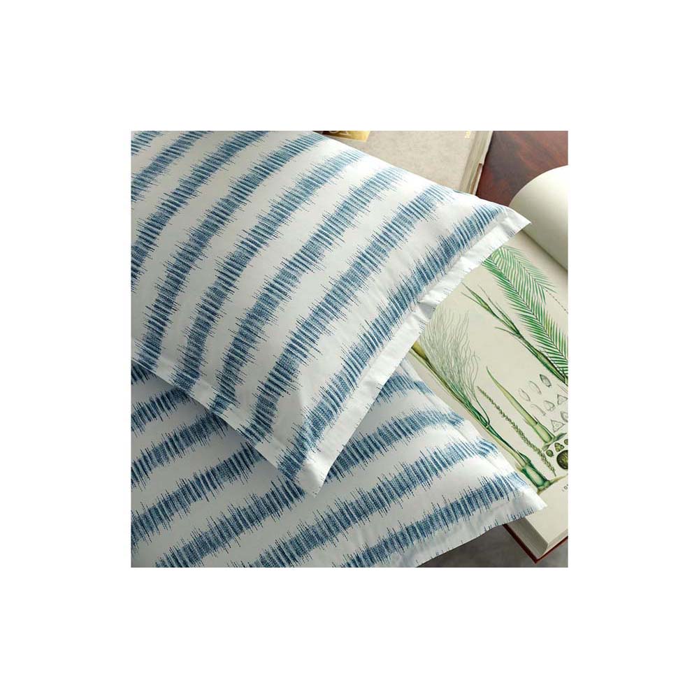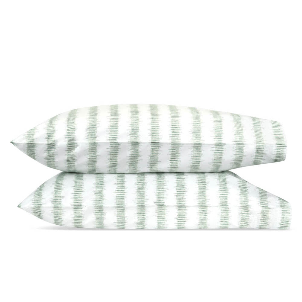 Attleboro, a print drawn from an archival Schumacher design, mimics the distinctive look of dyed textiles; here, Ikat-like blurred strokes are arranged in hazy stripes and printed on our 500 thread count Luca Egyptian cotton percale. Attleboro's palette of subtle colors matches back beautifully to our bold Pomegranate print, bringing a modern verve to that traditional pattern.