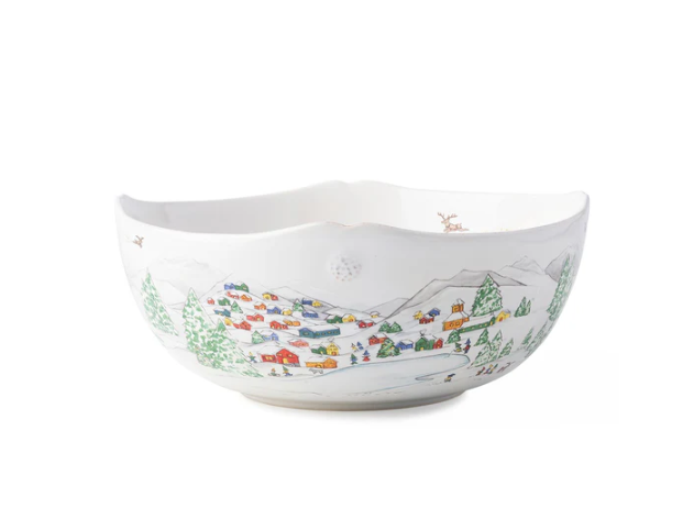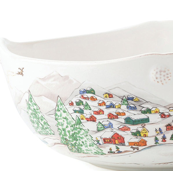 The mythical, folkloric world of the North Pole is hand illustrated atop iconic Berry & Thread shapes in this new holiday collection. Find the elves’ village and Santa’s cottage depicted on this serving bowl with subtle scallop and berry detail along its edge.