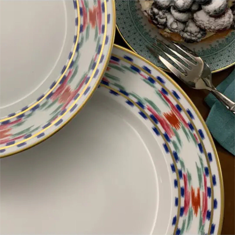 This vibrant reprise of a pattern in the Mottahedeh archives captures the vibrancy of Bargello needlepoint and the versatility of its antique origins. Like the needlepoint style for which it is named, Bargello combines seemingly random dashes of blue, green and pink, rimmed with gold, to coordinate with contemporary and classic Mottahedeh patterns. This pattern is adapted from a plate circa 1810. Today's porcelain enthusiasts will enjoy the adaptability of the dinner and dessert plates to mix with coordinating patterns.