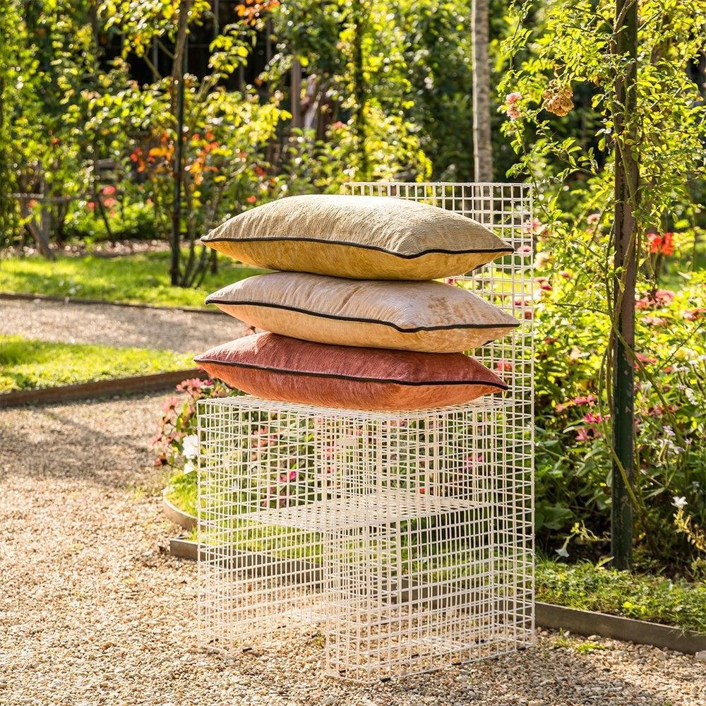 A palazzo spirit; an irregular and matte texture characterises this generous linen velvet in bright shades. The cushions are highlighted with a dark velvet piping.