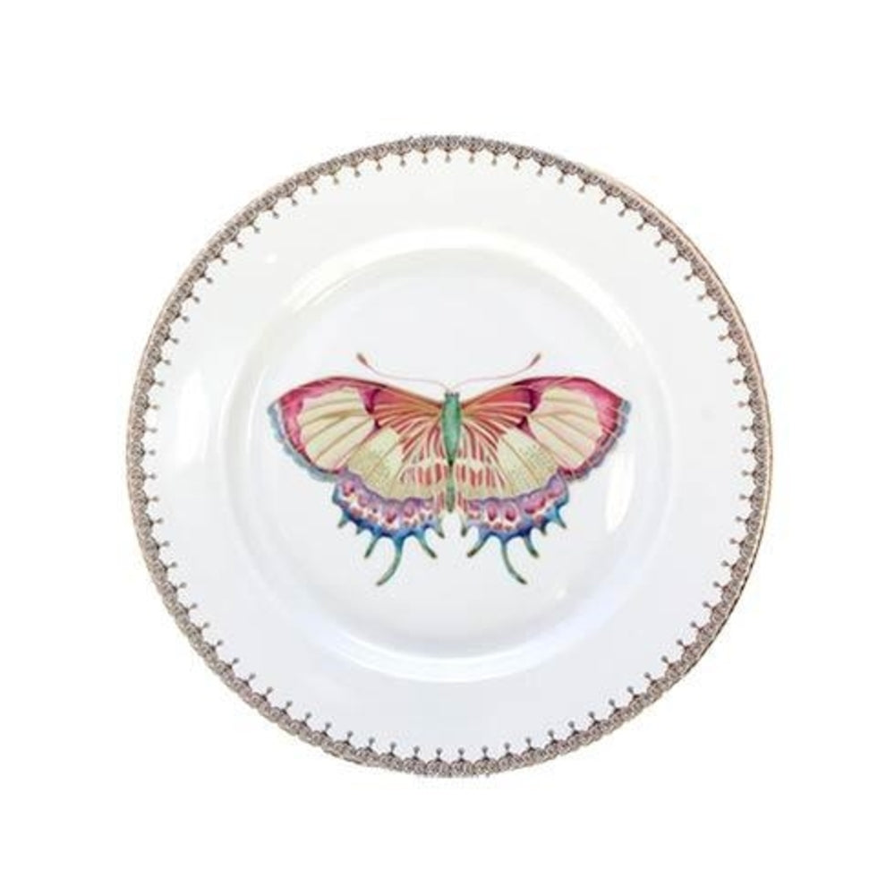 The Mottahedeh Butterfly Dessert Plate features an exotic butterfly with its opulent colors and 22k gold detailing. Makes a statement paired with Mottahedeh's lace service plates, or even the Tobacco Leaf collection.