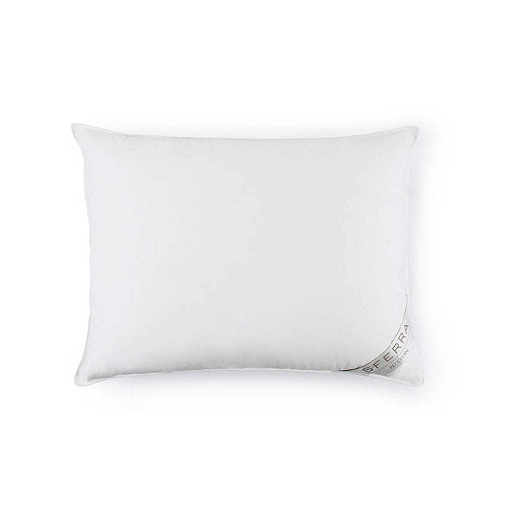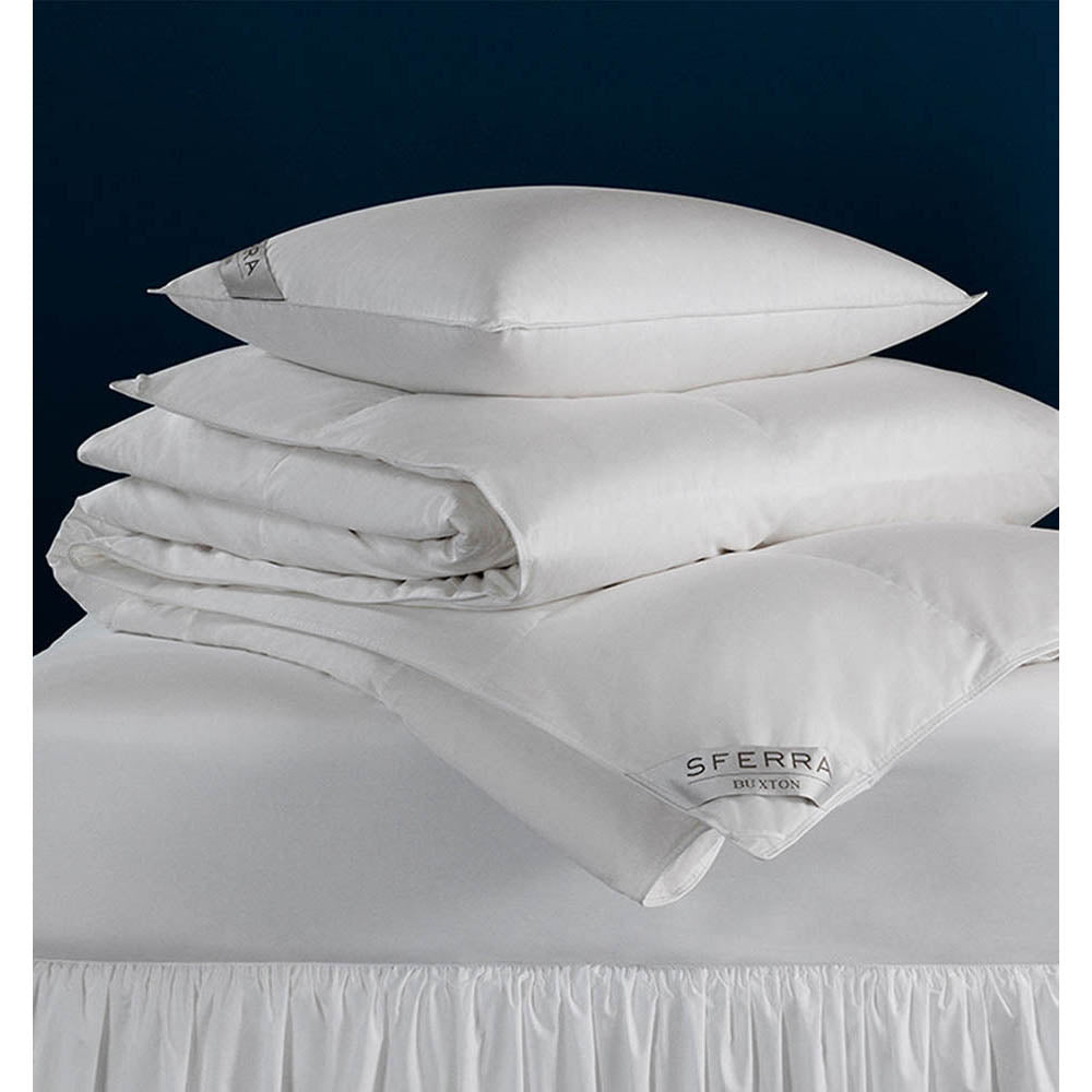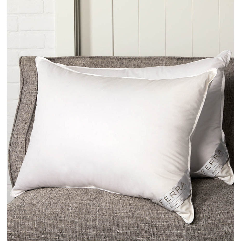 Buxton Goose Down Pillows are 600+ fill power European White Goose Down sleeping pillows with 350 thread count batiste ticking and 12" baffle box construction. Sleeping Pillows are available in three support levels - Soft, Medium, and Firm. All Buxton Pillows are finished with a decorative piped edge, and have corner silks on the surface, which showcase the SFERRA brand and product name.