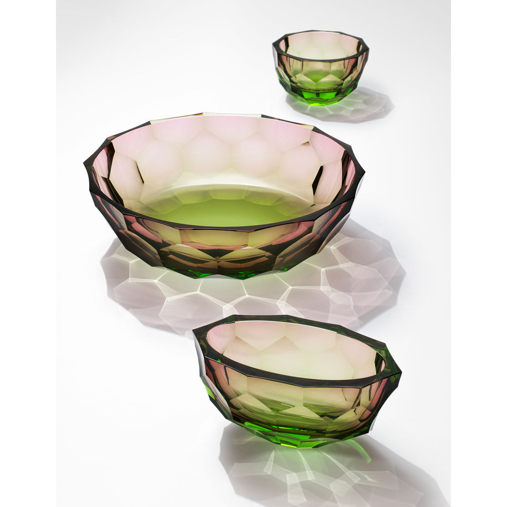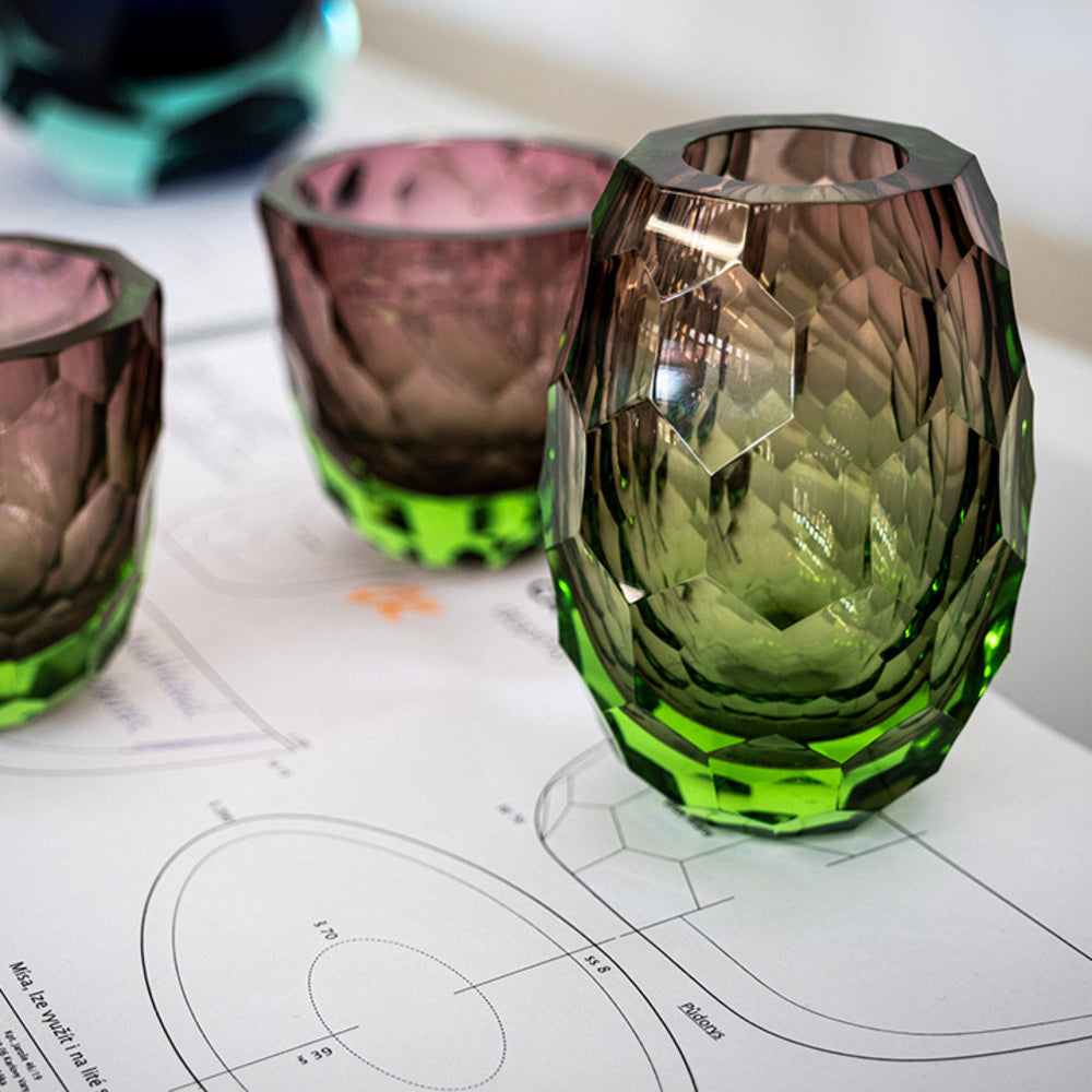 Caorle is a beautiful historic town near Venice, but also a set of mouth-blown cut vases and bowls inspired by the beauty of the town. "The seemingly simple shapes are adorned with deep, hand-cut honeycomb patterns, perfectly and precisely intertwined to create a spectacular play of light effects on the surface," explains the author, Lukas Jaburek. The design of the vase originated in 2015 and is rendered by more than ten pairs of hands.