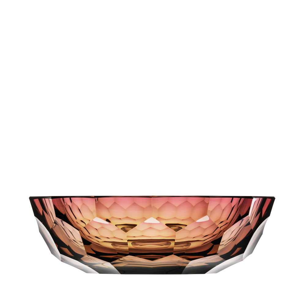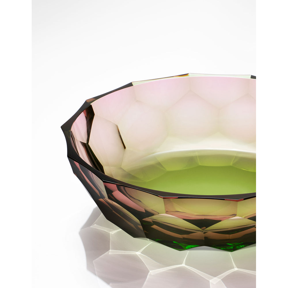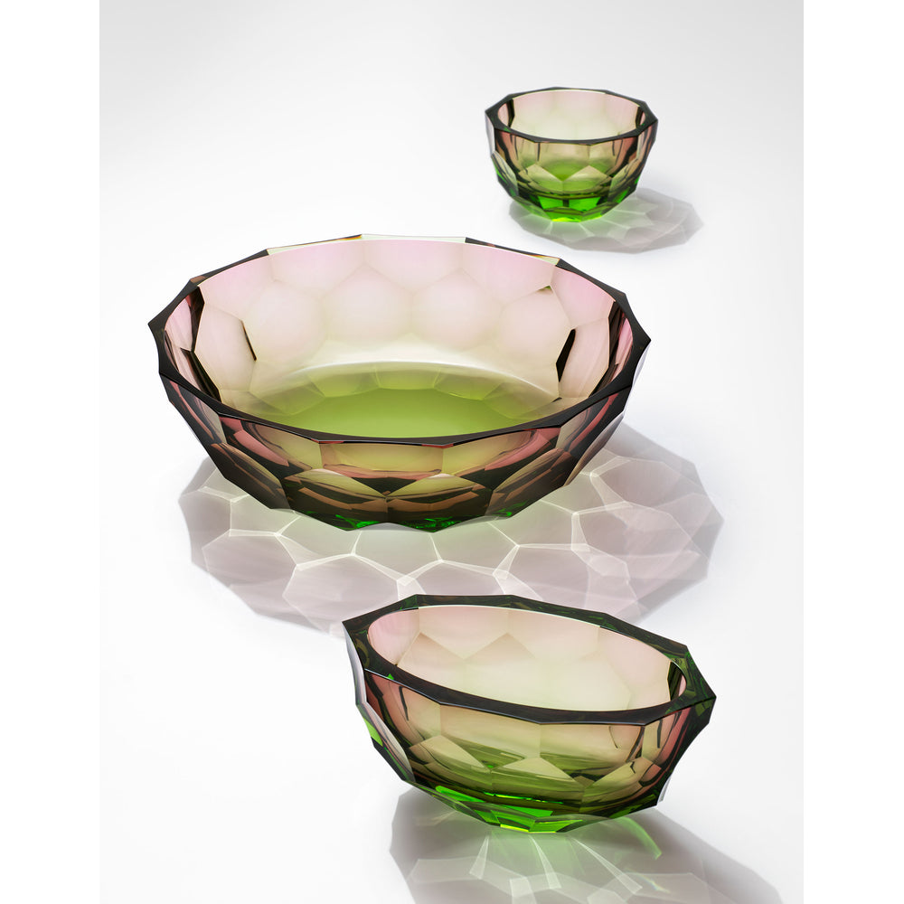 Caorle is a beautiful historic town near Venice, but also a set of mouth-blown cut vases and bowls inspired by the beauty of the town. The basic ovate shape of the robust vase is broken up into a symmetrical geometric decor of a mosaic by an artful cut. The decor is pre-drawn and requires extreme precision on the part of the cutter. Thanks to the popularity of the design of the Caorle vase, the set was expanded in 2020 with bowls.
