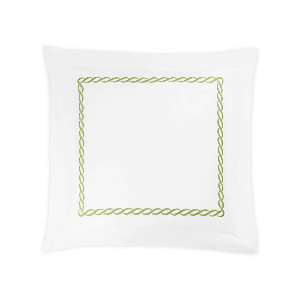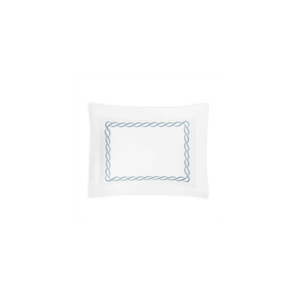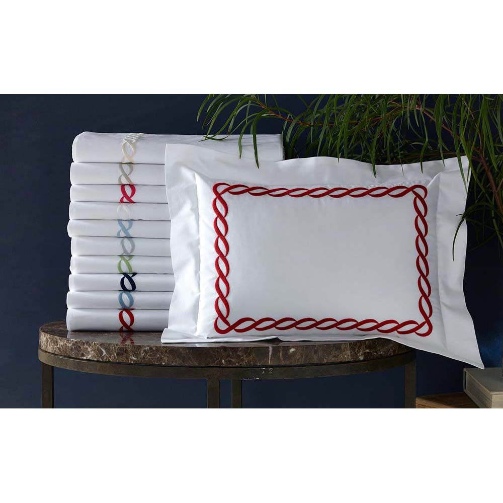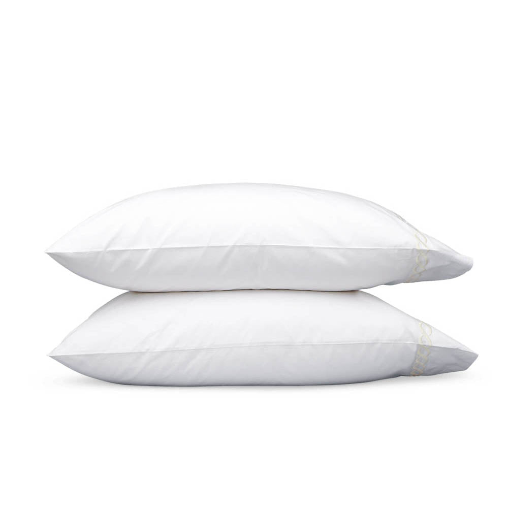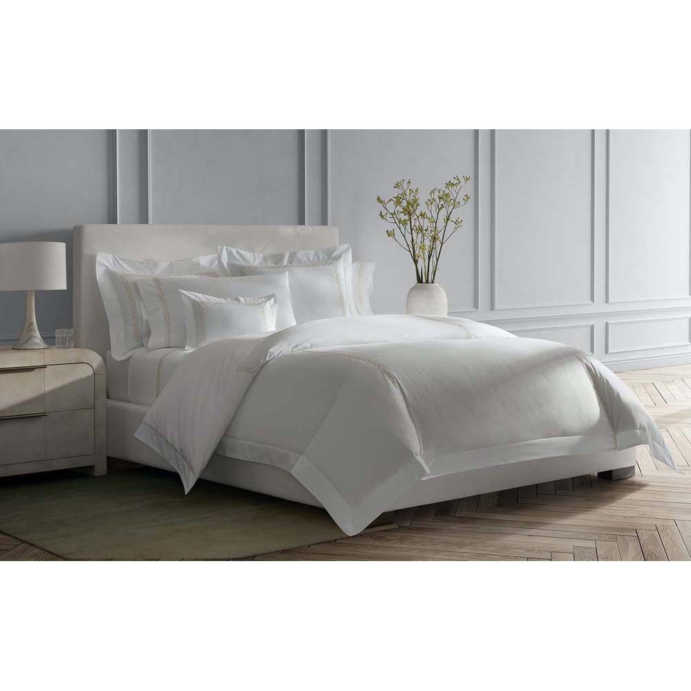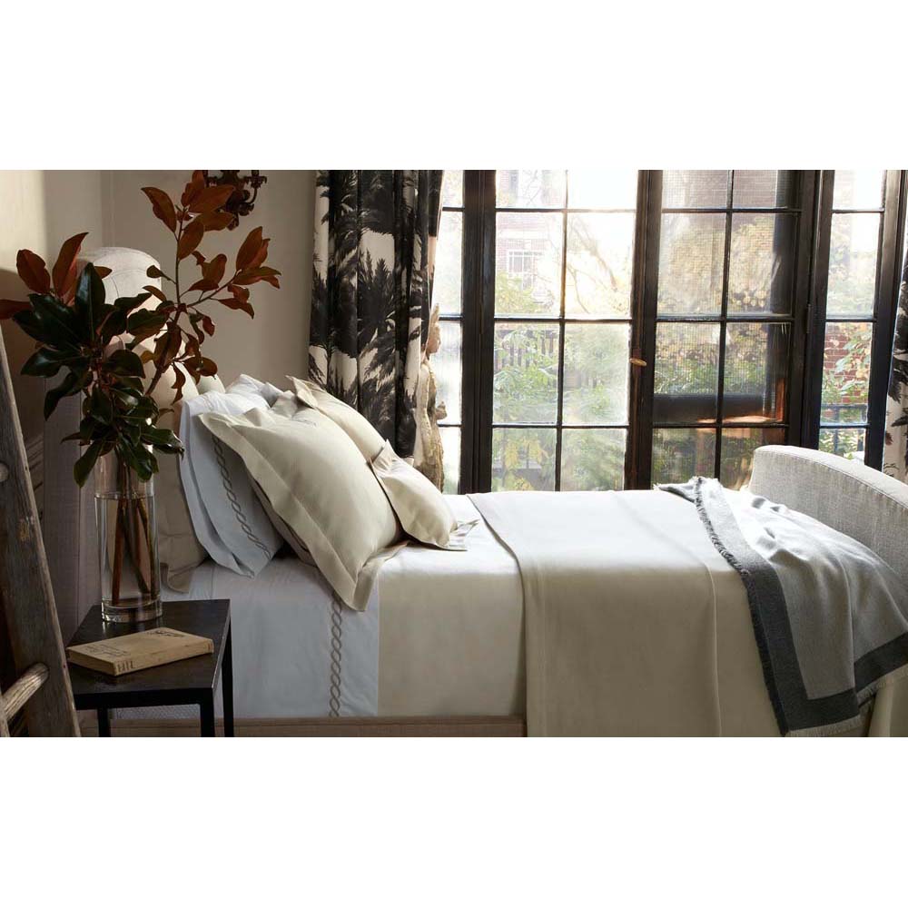 Inspired by a classical Greek motif, a fluid chain embroidery on our 350 thread count Sierra cotton percale creates an understated look for your bedroom.