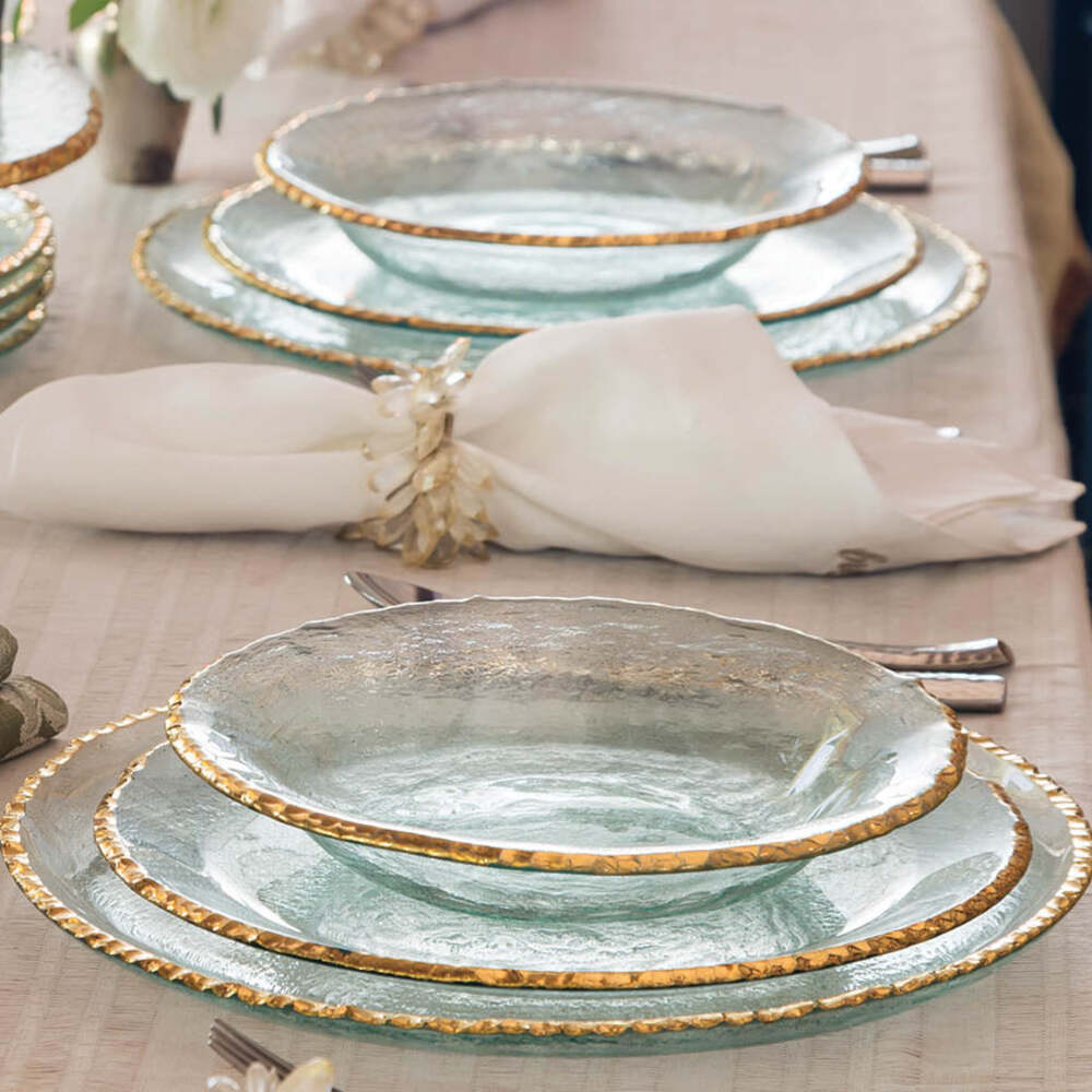 The Edgey Charger, a clear glass circular plate with hand chipped & hand-painted 24kt gold or platinum rim, sets the stage for the Edgey Collection's luxury dinnerware pieces.