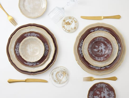 If you love to dare on the table with colorful flat plates, play with different shades from the same collection, creating unusual and surprising combinations. The warm, deep tones of the Meringa line complement the colorful universe of the Oriente Italiano collection, which lends itself to endless color combinations, from delicate Castagna, to elegant Aurum, to refined Pervinca.