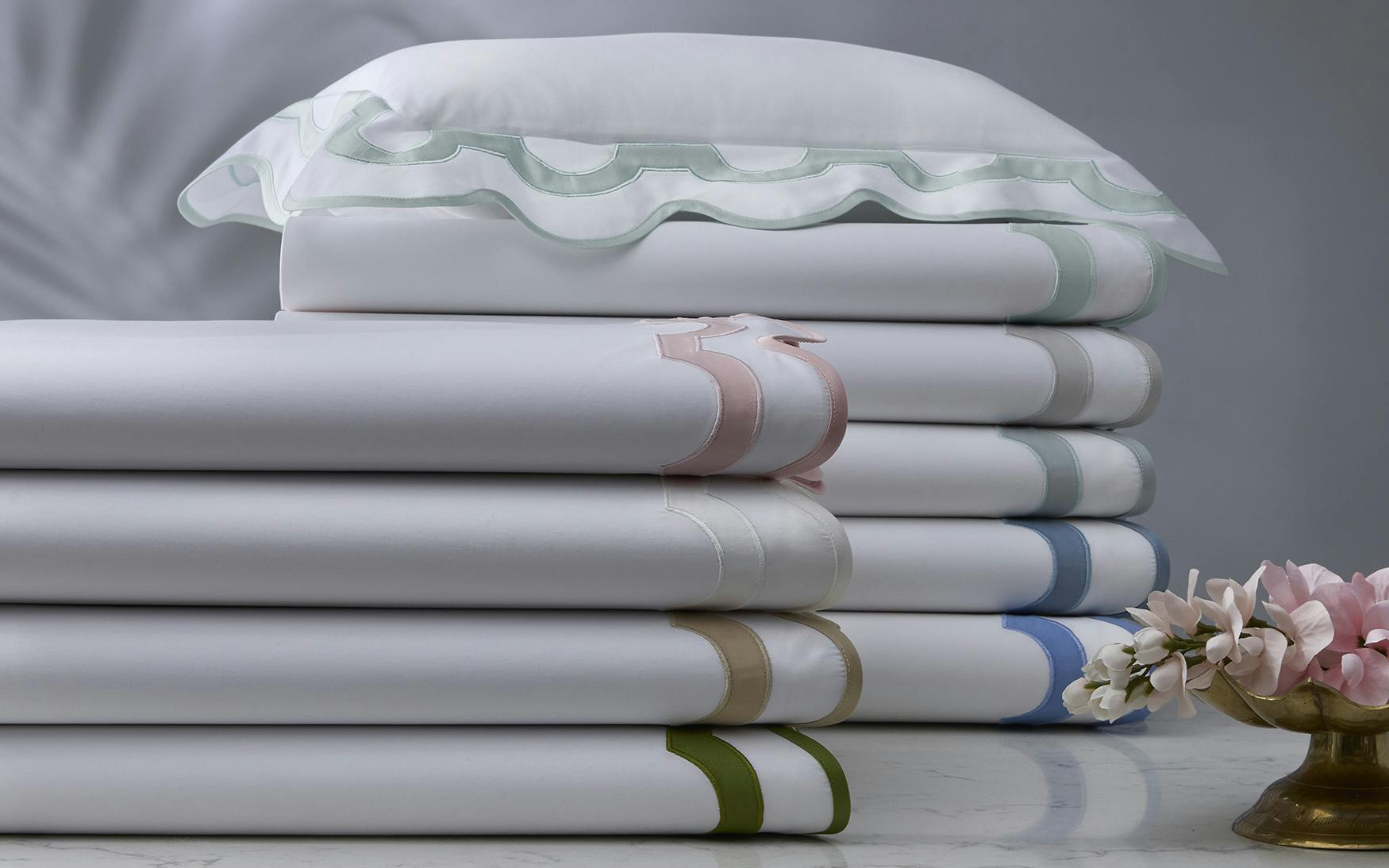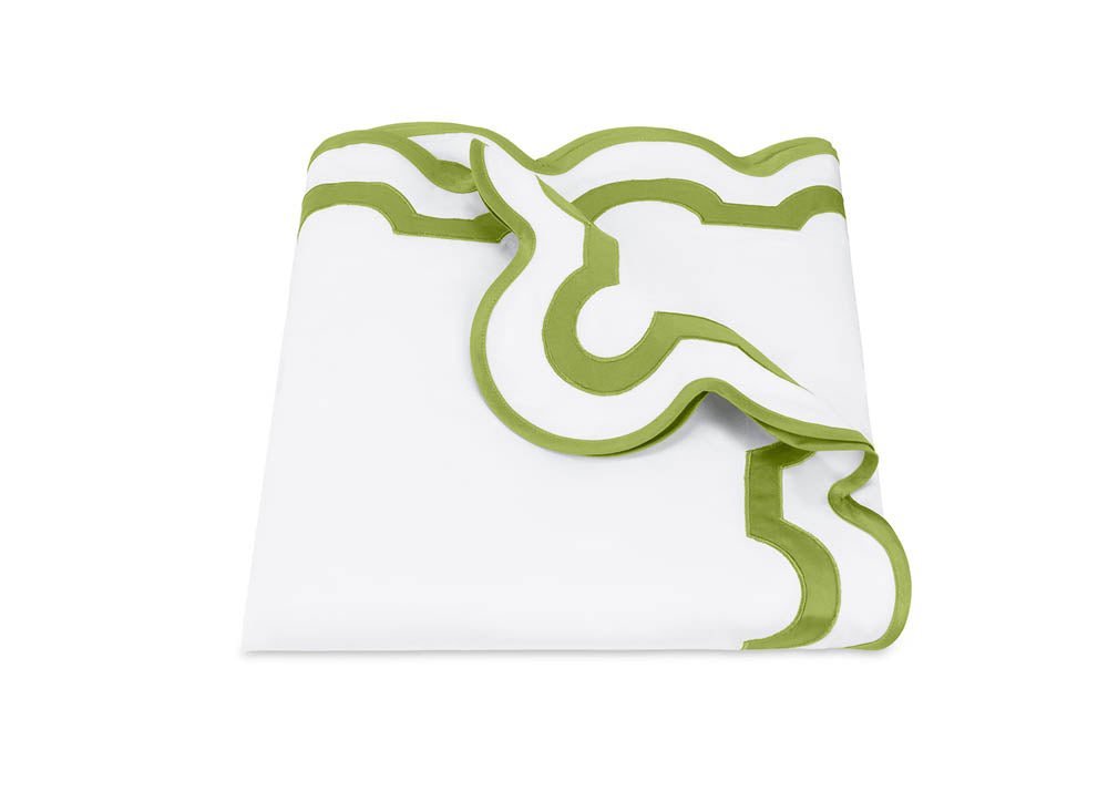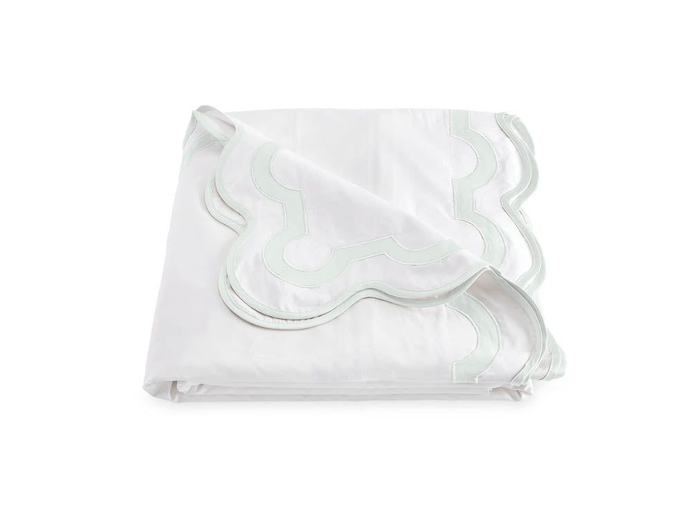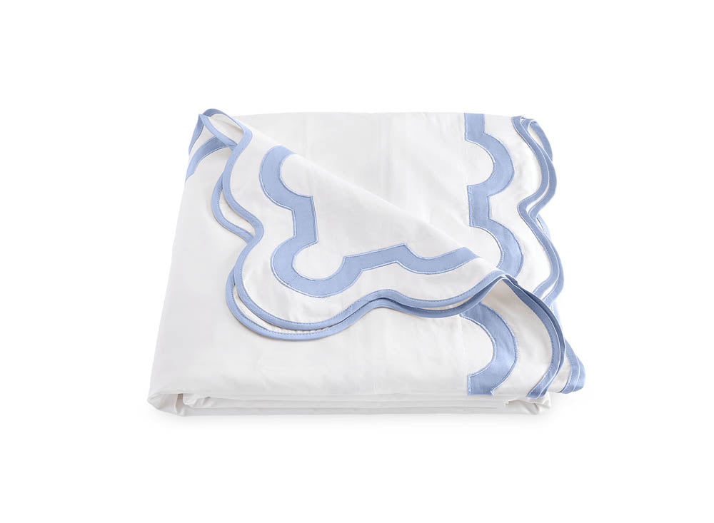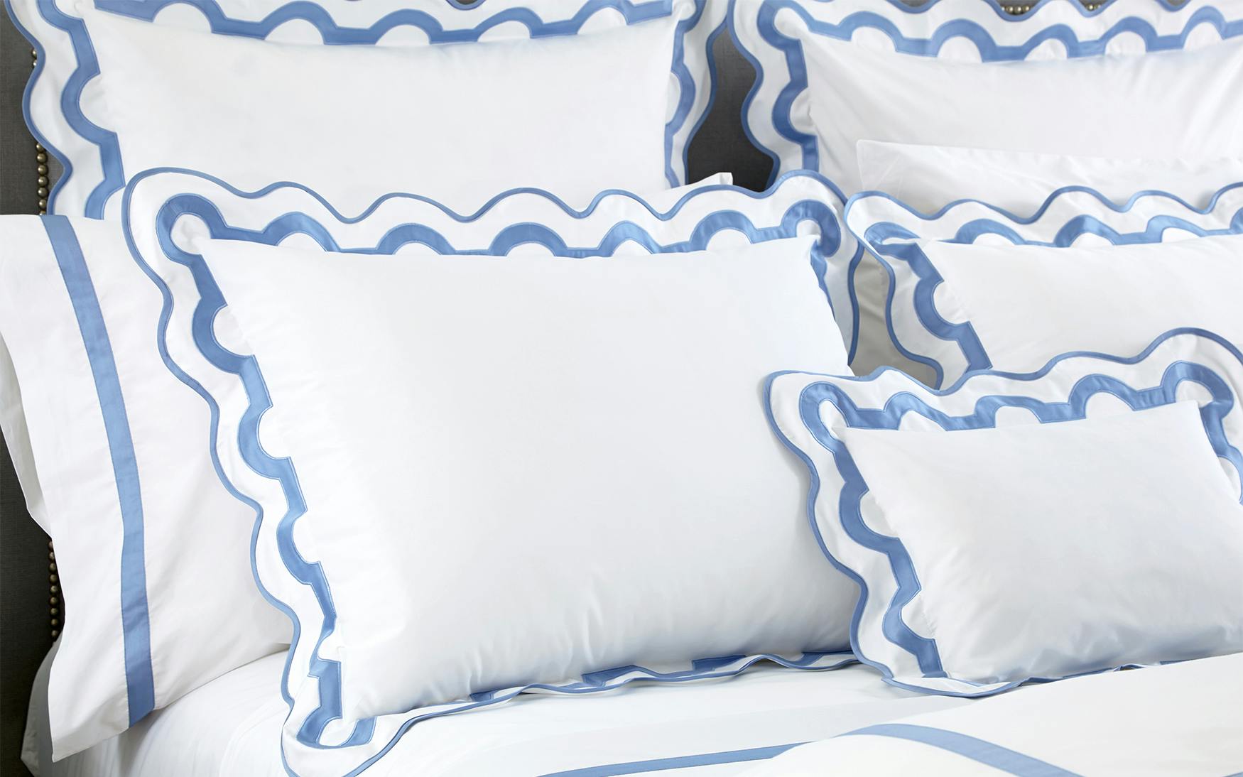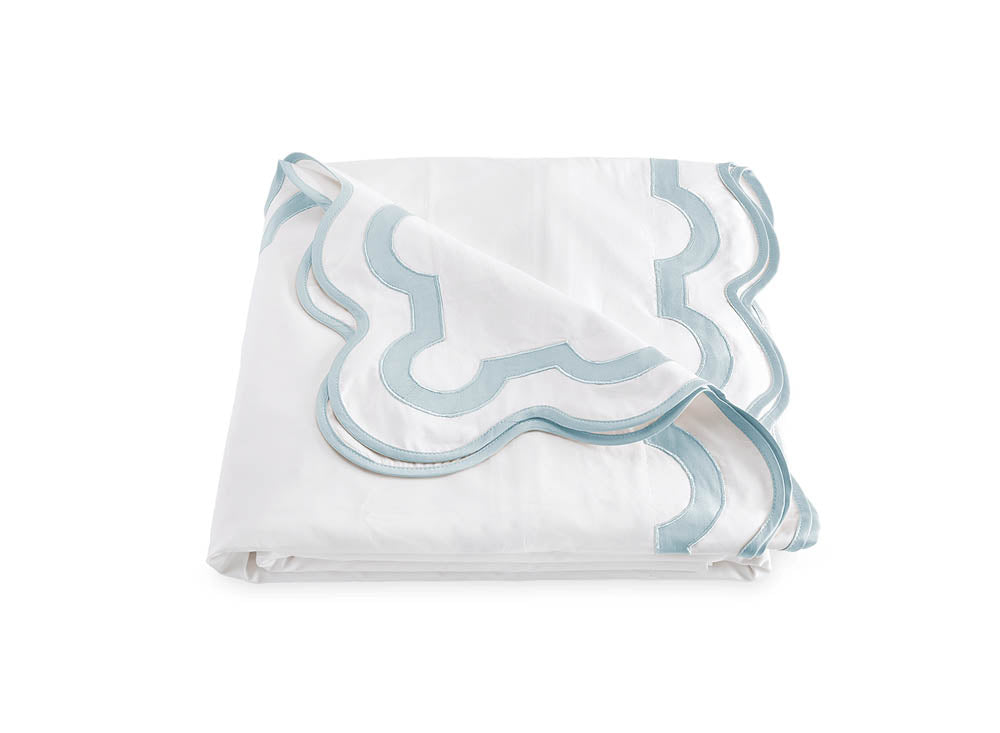 Inspired by a stroll down Worth Avenue in Palm Beach, the unique arch trim of shop awnings becomes a tasteful complement to our soft and luxurious 600 thread count Milano Egyptian cotton percale bedding, made in Italy.