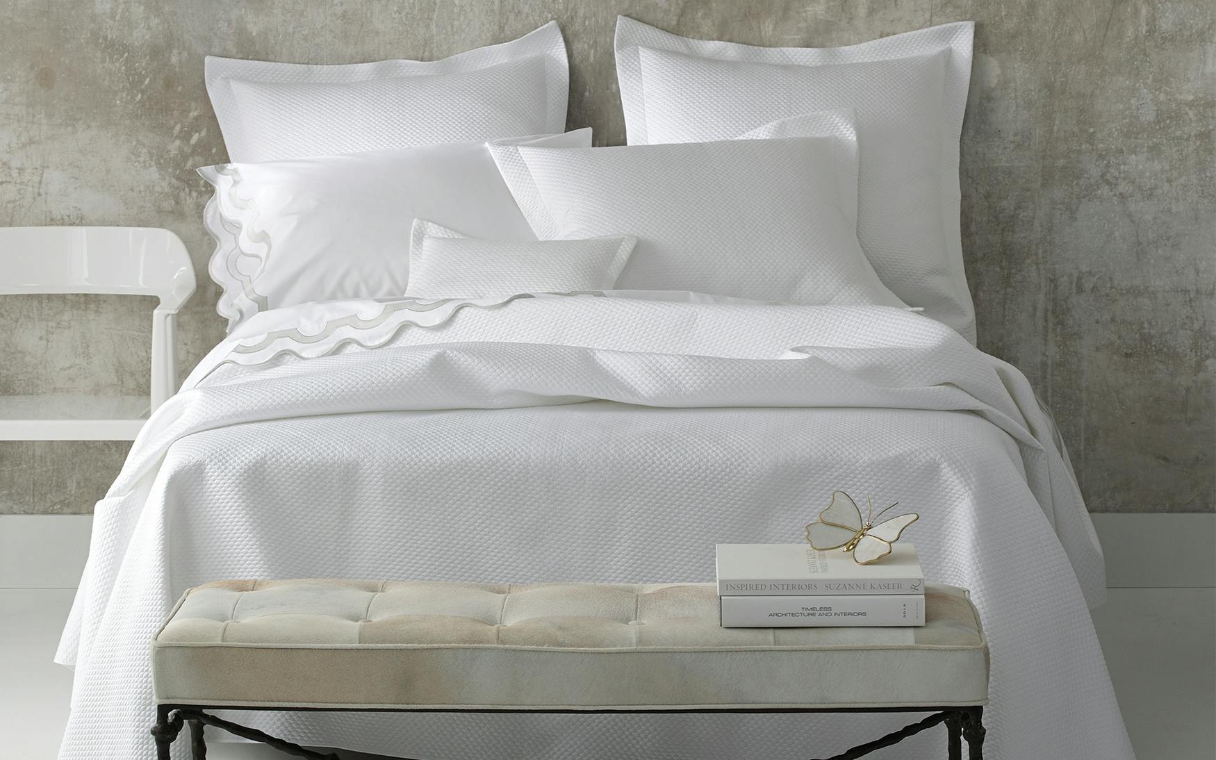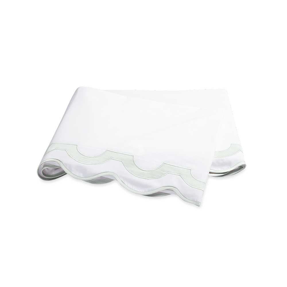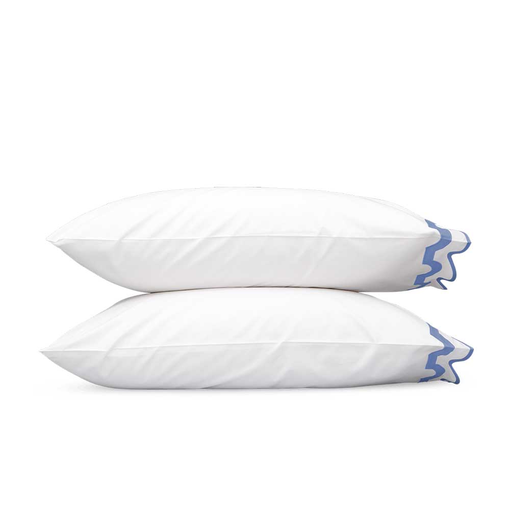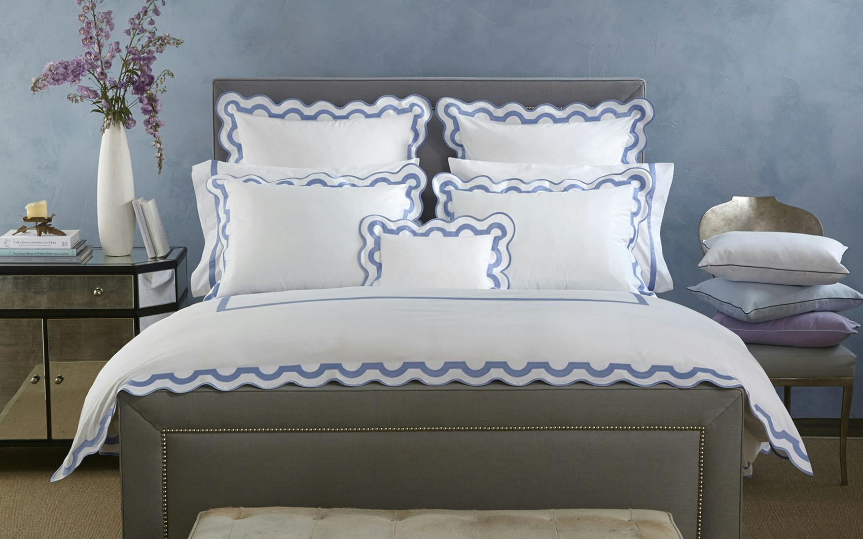 Inspired by a stroll down Worth Avenue in Palm Beach, the unique arch trim of shop awnings becomes a tasteful complement to our soft and luxurious 600 thread count Milano Egyptian cotton percale bedding, made in Italy.