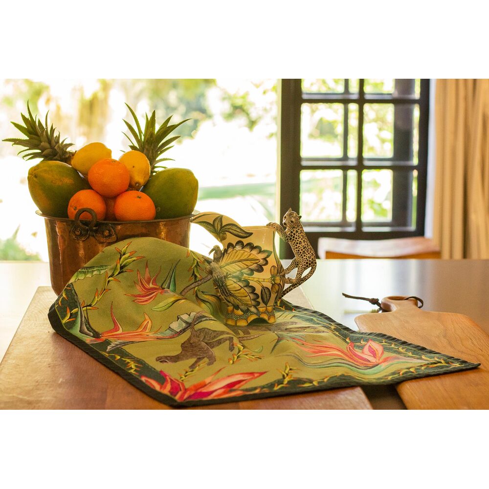 Maximalist design leaps off the fabric of our tea towel from South African ceramic art and design house Ardmore. This cotton tea towel features the striking imagery from Ardmore Designs' Zambezi fabric collection. The "Monkey Paradise" pattern features playful vervet monkeys crawling amongst the striking bloom of the Strelitzia.
