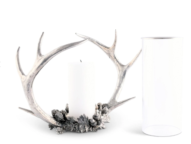 Dramatically designed, our Lodge Style Pewter Antler Hurricane captures the creative imagination with its unique embodiment of the wilderness theme. Distinct pewter antlers encircle the glass hurricane with realism; the ring spiraling from a base adorned with intricate details such as acorns, leaves, and pinecones. The generously sized hand-crafted piece of 17" W x 10" T inches effortlessly becomes the perfect centerpiece for your rustic style birthday celebrations or wilderness-themed Thanksgiving gathering. Not just a beauty piece, its large size ideal for holding your pillar candles, highlighting the remarkable definition within the realistic designs rimmed in exquisite pewter.