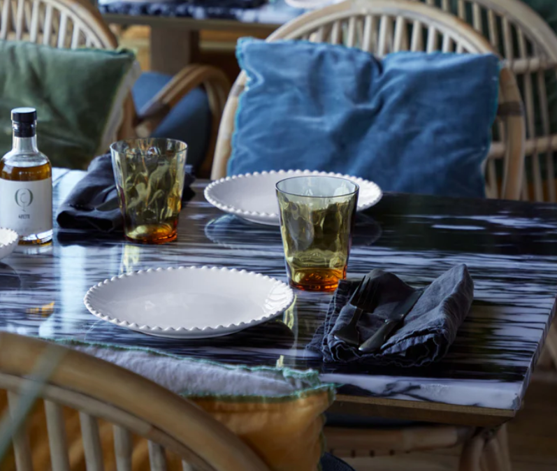 The Salad/Dessert Plate, made from fine stoneware and crafted in Portugal, features a rim decorated with Pearls and a hand-brushed finish, giving it a unique, artisanal touch.
