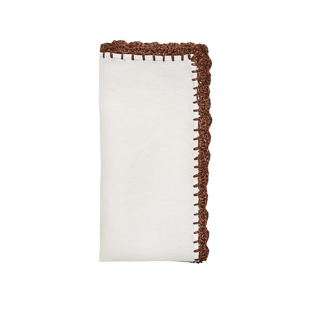 The Shell Edge Napkin features a hand-crocheted scalloped edge, made with natural raffia. An organic update to a classic white linen napkin, the Shell Edge adds a refreshing note to any decor.