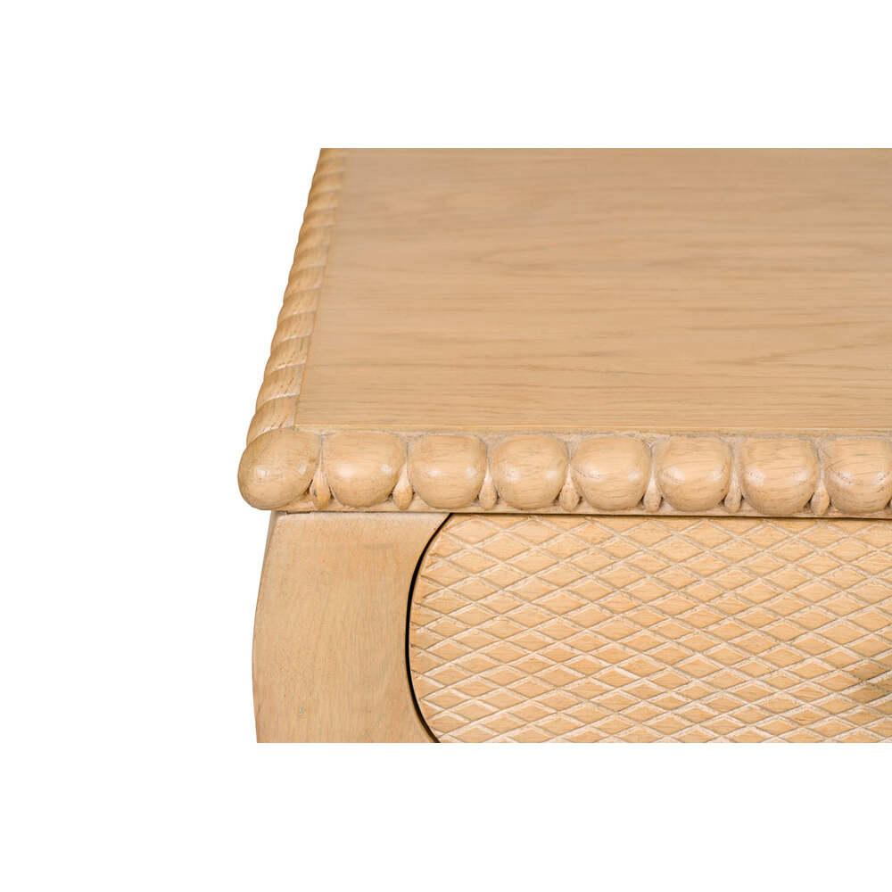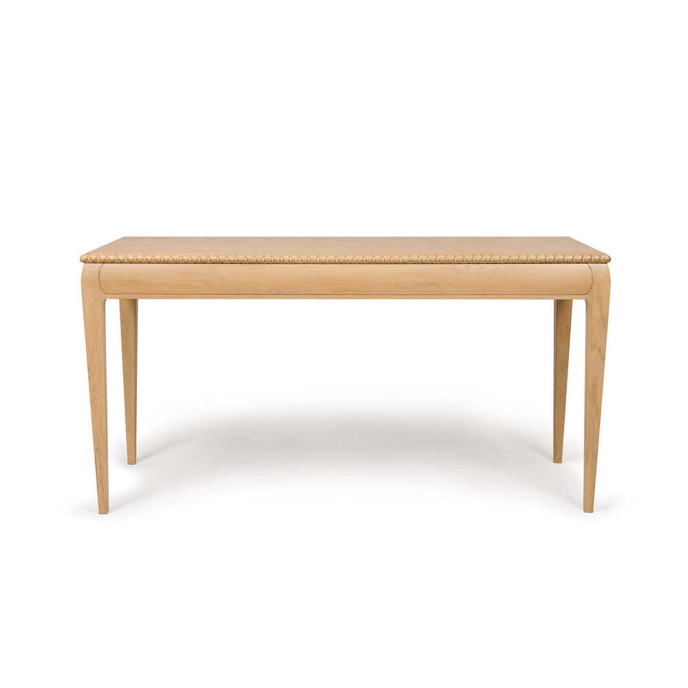 Our Sofia desk is defined by both its warm, grey-washed oak finish, and its writing surface surrounded by rounded dentil moulding, an elevated work space complemented by refined taper legs and three drawers for keeping your work area tidy. Brass pulls and cross-hatched drawer fronts.