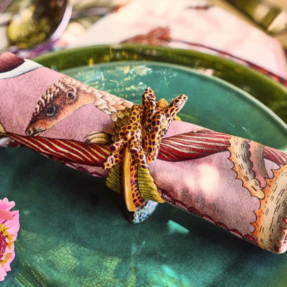 Immerse yourself in the exquisite realm of Ardmore with the Thanda Stripe Napkins in Delta. Each piece in this luxurious pair is more than just a napkin, it's a masterpiece that weaves the untamed spirit of Africa into your dining experience. Crafted from premium 100% cotton and adorned with vibrant scenes of wildlife, the design features the shy zebra and unique pangolin.