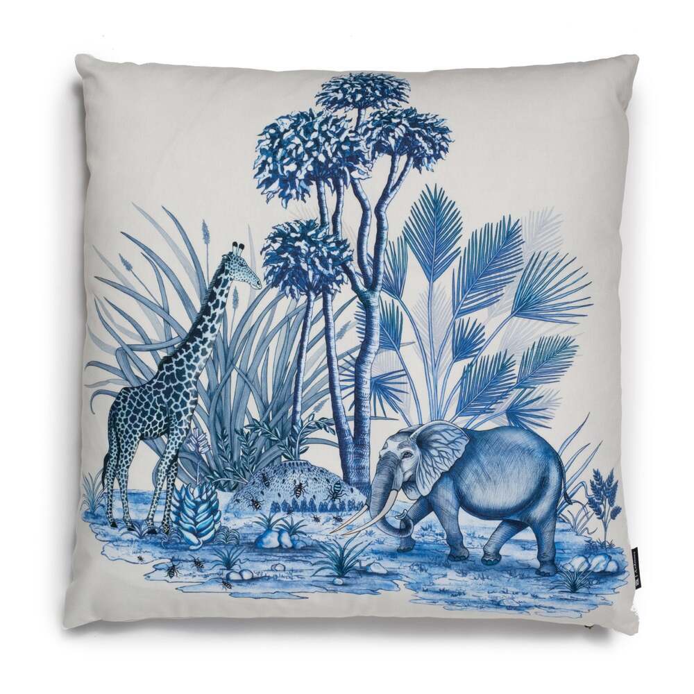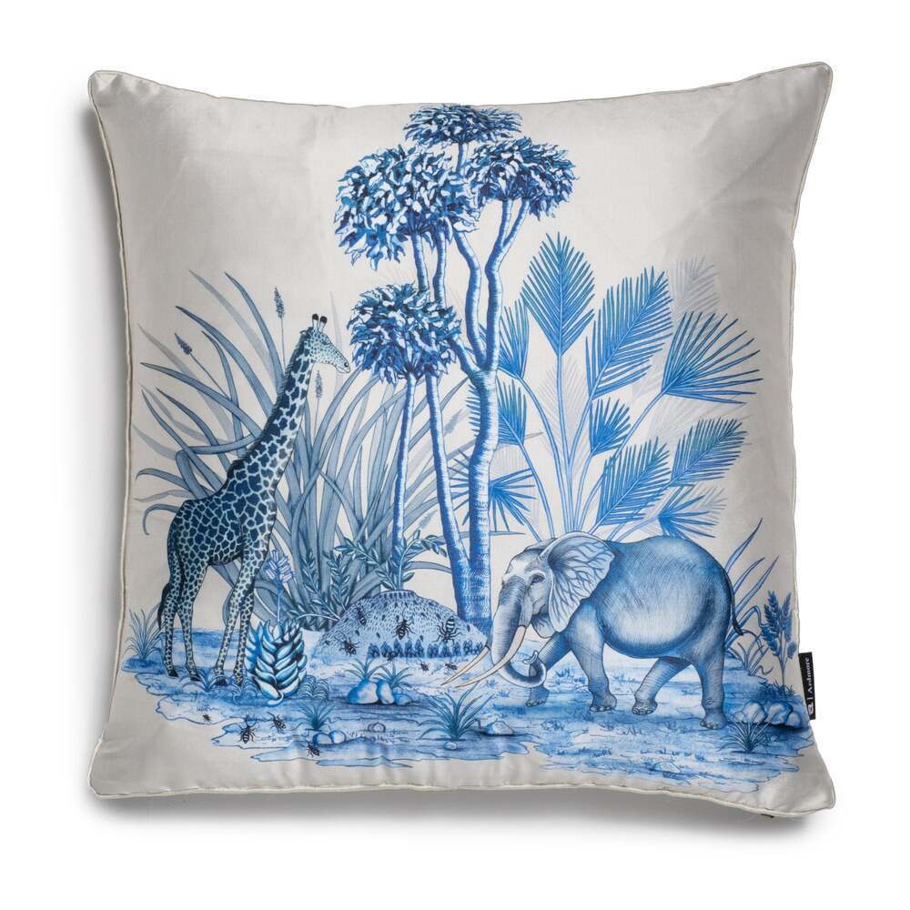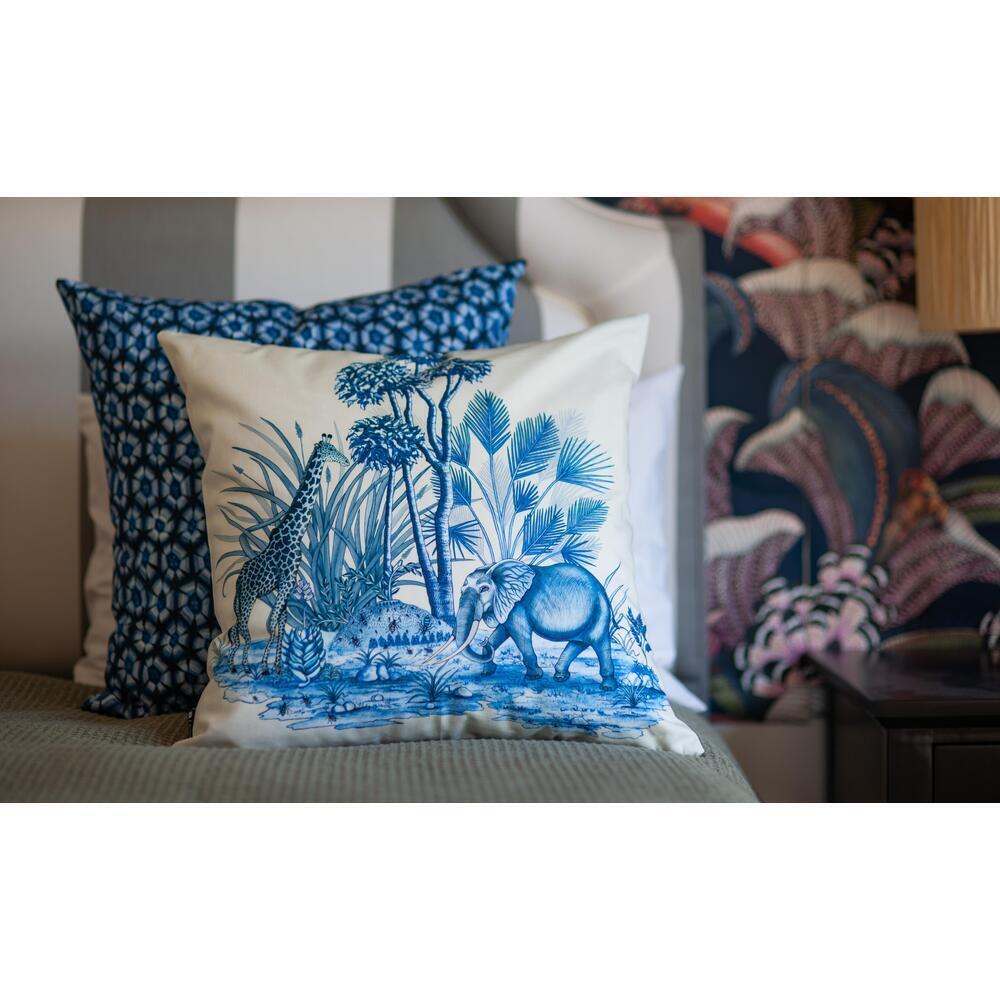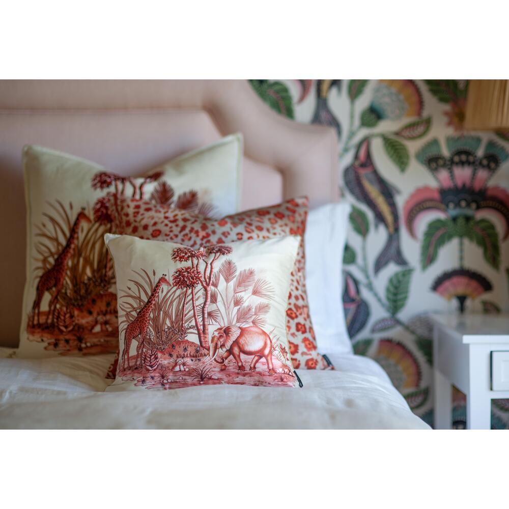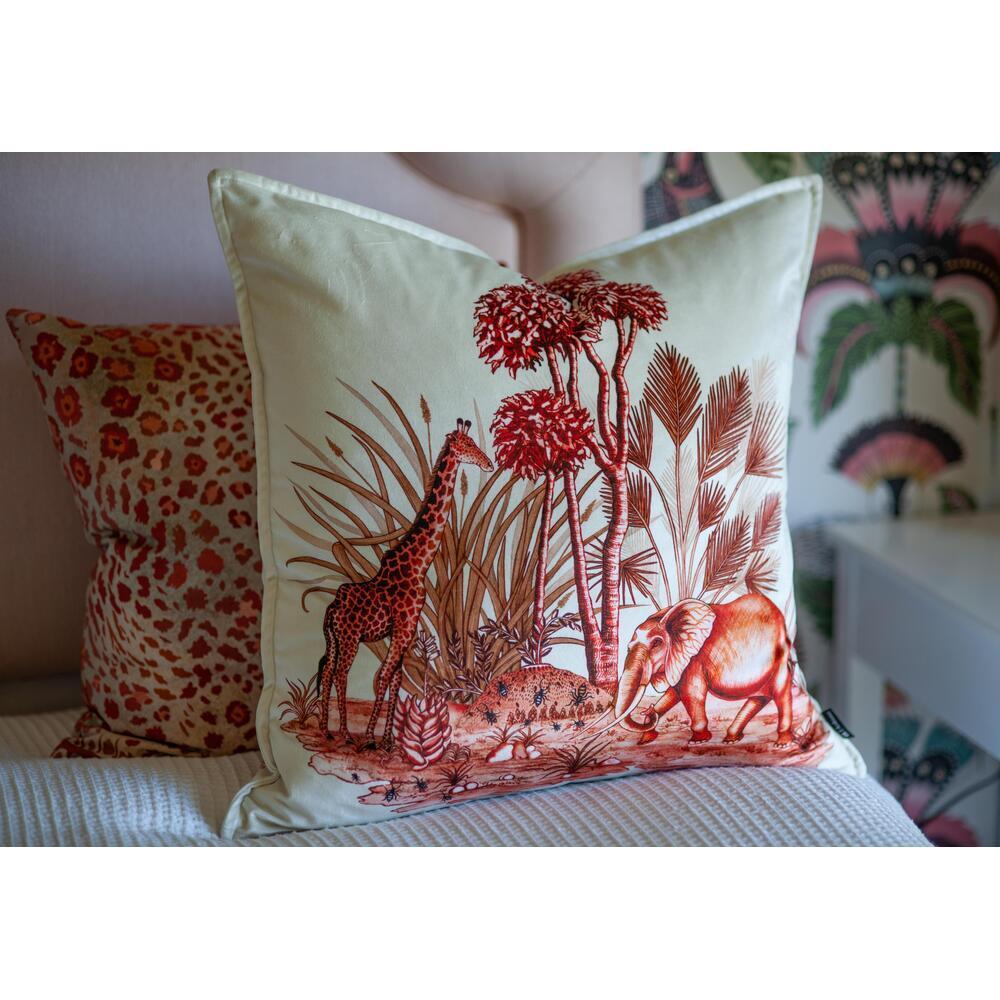 Sightings of elephants, warthogs, giraffes and crowned cranes among the Candelabra Ficus and Kiepersol trees prompted the creation of the new Thanda Toile fabric design. Available in Silk, Cotton and Velvet. Every pillow cover is cut and sewn by hand in our Johannesburg workshop. A 95% feather / 5% down insert is included.